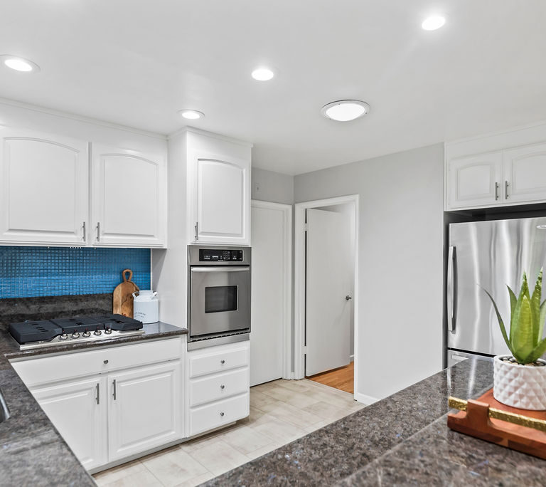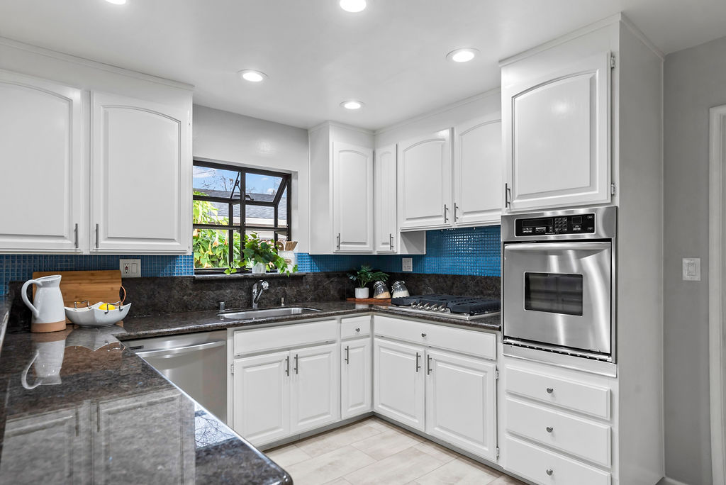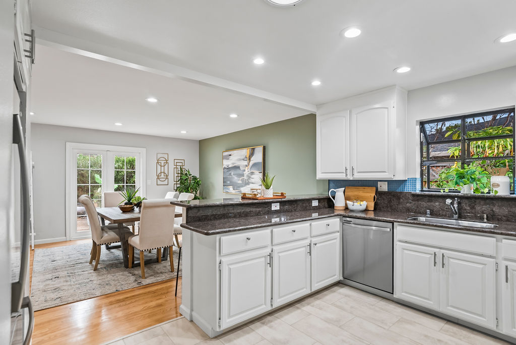You’ll love the open-concept layout and a kitchen that shines with beautiful cat-eye granite counters, blue tile backsplash, peninsula with seating, LVT flooring, and a bright box bay window overlooking lush plants. There’s a large dining room; cozy living room with fireplace; and bonus space off the living room ideal for additional seating, dedicated playroom, or hobbies! Two sets of elegant French doors open to the inviting backyard with a wood deck and paved seating area perfect for entertaining or relaxing in the Bay Area’s desirable year-round weather.